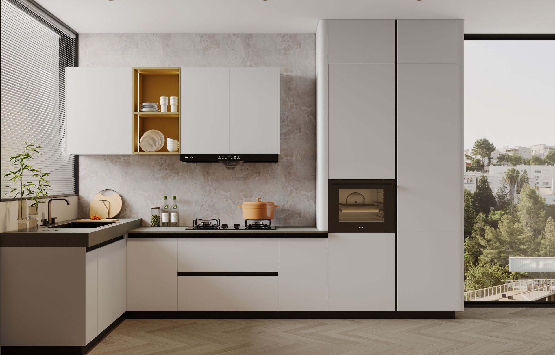 通过hth·华体厨柜量体裁柜,定制出适合主厨下厨的烹饪区和洗涤区的舒适高度。